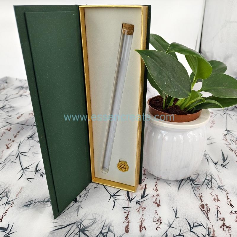 This incense stick gift box is made of high-end specialty paper, integrated with auspicious cloud gold stamping patterns and gold frame edging technology. Three colors of Chinese red, ink black and ink green interpret oriental aesthetics. The box is equipped with an acrylic single tube and sponge inner lining, specially designed for long incense sticks to prevent moisture and folding, and is also matched with metal incense holder accessories to enhance the user experience. The flip-top structure is easy to open and close, and LOGO, patterns and sizes can be customized according to needs. It is suitable for scenarios such as aromatherapy store wholesale, high-end business gifting and festival presents, and is a quality choice for incense stick packaging and storage.