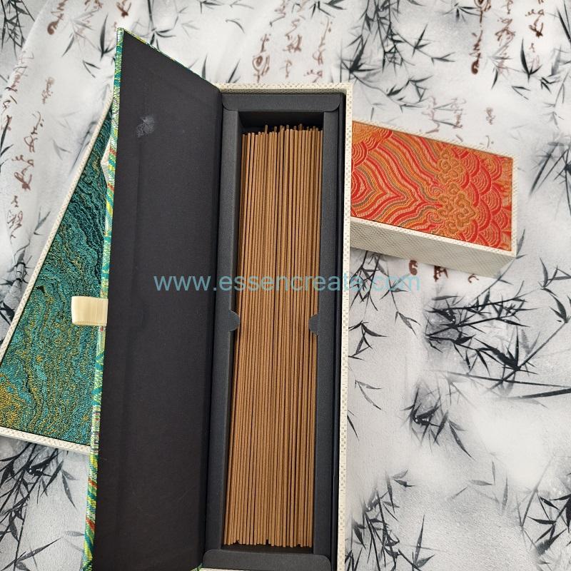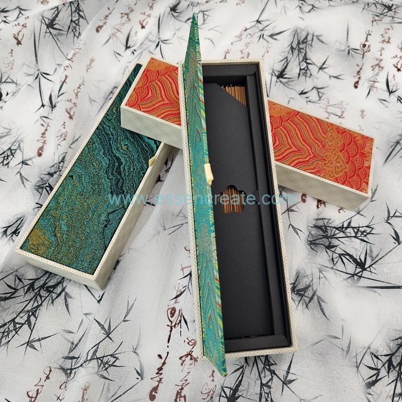 This coil and incense stick gift box is made of brocade fabric combined with hard cardboard, with classical brocadepatterns on the box surface. Mutiple colors such as bright red and volcanic green show the oriental ancient charm. Thegift box is divided into square and strip styles, with a 60g capacity that can adapt to the storage of coil incense andincense sticks. The built-in sponge card slot can fix the incense products to prevent transportation damage. The flip-top/sliding structure is easy to open and close, supporting LOG0, pattern and size customization.It is suitable forscenarios such as aromatherapy store wholesale, high-end business gifting and festival presents, and is a classic choicefor incense ceremony packaging.