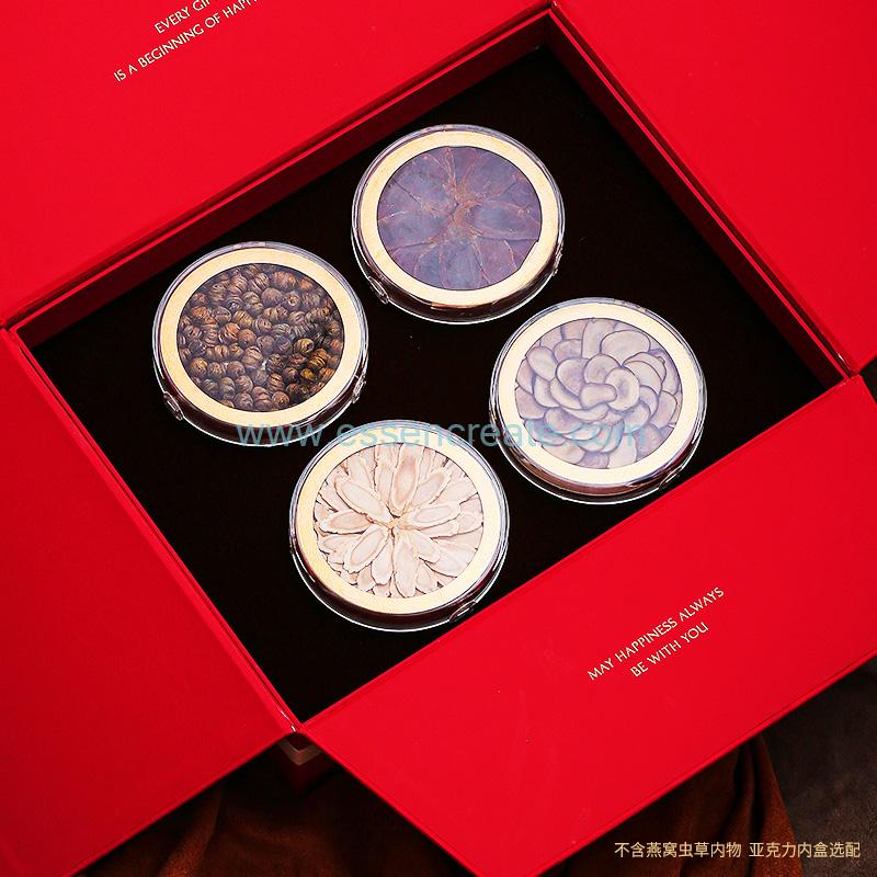 This is a high-end red velvet gift box specially designed for health supplements. It features elegant appearance, double-door structure, and soft inner lining, which is very suitable for packing bird’s nest, ginseng, cordyceps, and other tonic products. The box is sturdy, durable and reusable. We support custom logo, size and inner tray to meet different brand and market needs. It is an ideal packaging choice for festival gifts and business gifts.