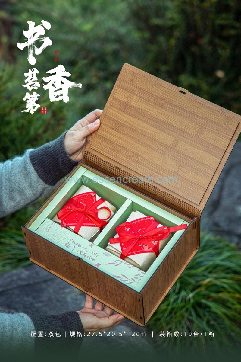 This "Shuxiang Mingdi" tea gift box features a book-shaped appearance made of bamboo-patterned wood, paired with a Chinese-style hollow window design.